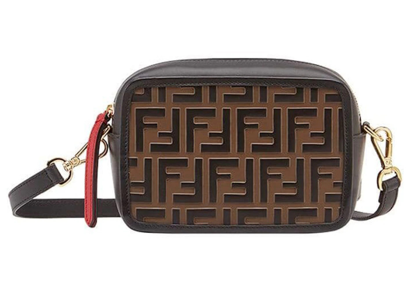 Fendi Camera Case Embossed Ff Mini Brown Black In Calf Leather With Gold Tone